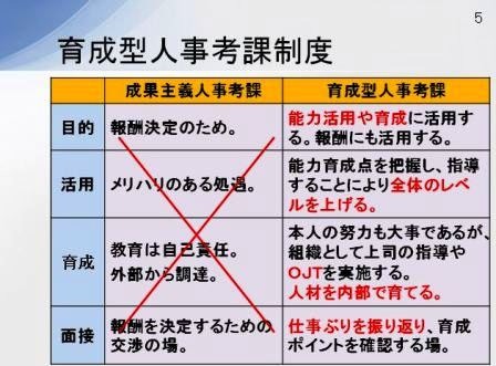 教育は自己責任であり、面接は報酬決定の交渉の場になります。これはこれでひとつの考え方ですが、当社の人事考課制度は成果主義の人事考課ではありません。